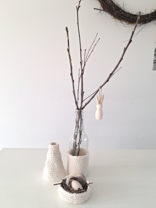 vrolijke paassetSet bestaande uit een glazen fles, een gehaakt vaasje en een gehaakt schaaltje.